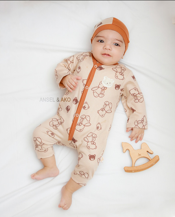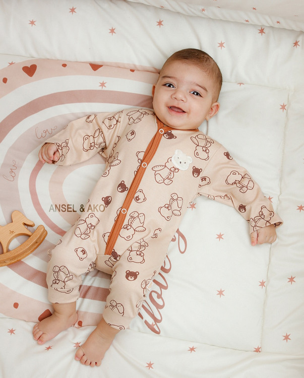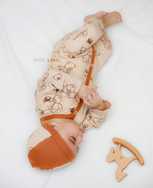 سرویس تیکه باز پسرانه مدل تدی رنگ کرم تمام چاپ خرس قهوه ای سایز صفر جورابدار سایز یک و دو مچ دار