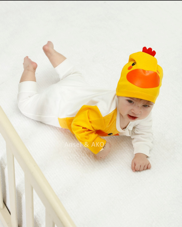 سرویس تیکه باز اسپرت (دخترانه/پسرانه) مدل چیکن رنگ استخوانی چاپ بزرگ جوجه سایز صفر جورابدار سایز یک و دو مچ دار مناسب گرفتن عکس ماهگرد و تولدآتلیه
