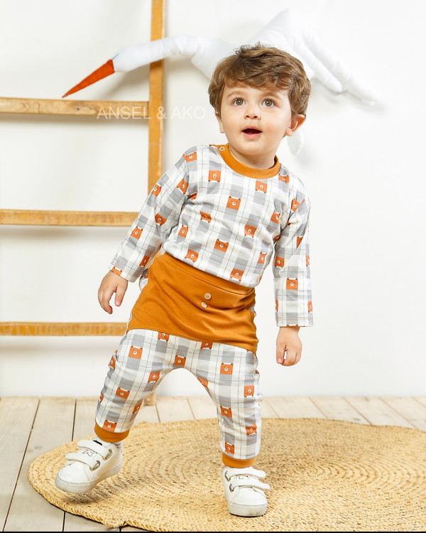 سرویس تیکه باز پسرانه مدل کله خرس رنگ تمام چاپ خرس /قهوه ای