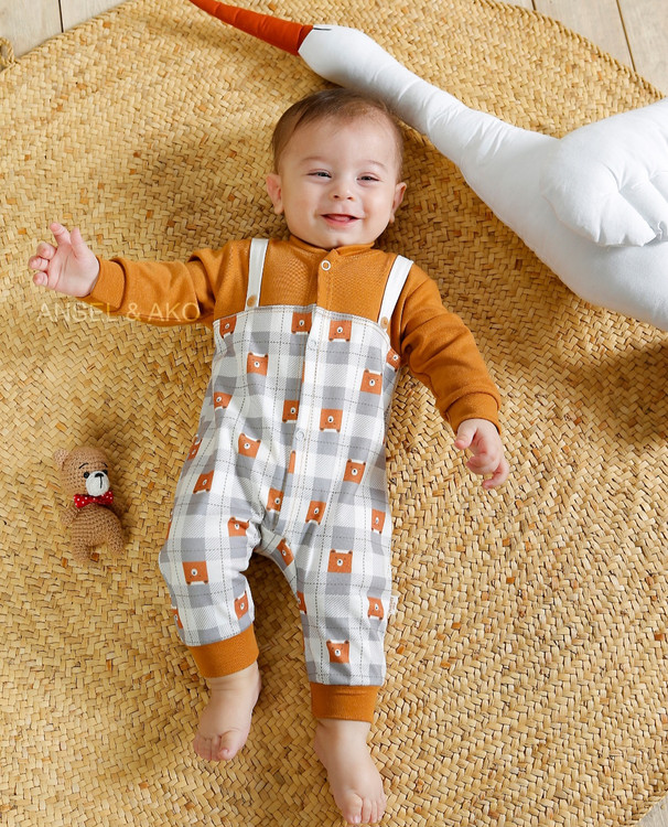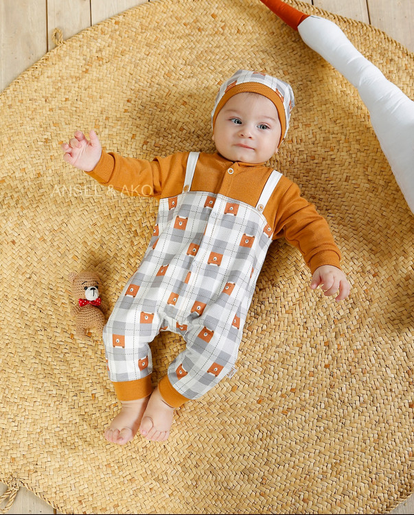سرویس تیکه باز پسرانه مدل کله خرس رنگ تمام چاپ خرس /قهوه ای سایز صفر جورابدار سایز یک و دو مچ دار