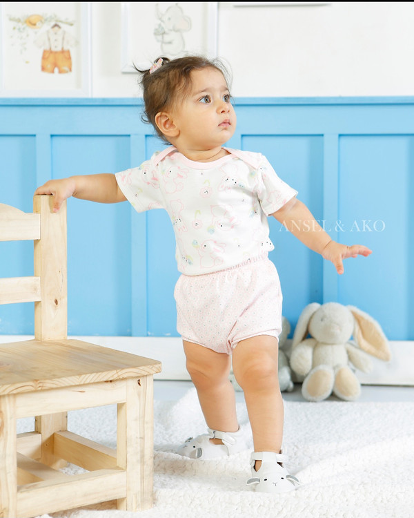 سرویس تیکه باز دخترانه مدل خرگوش و گل رنگ زمینه استخوانی تمام چاپ گل ریز صورتی